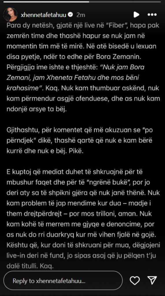 “Unë nuk i përndjek meshkujt, mas pari unë nuk jam Bora Zemani, unë jam Xheneta Fetahu, unë kurrë nuk i shkoj prapa një mashkulli, ose më mbanë para duarve dhe më vlerëson, ose hiqet, për mu kallen,” u shpreh Xheneta.