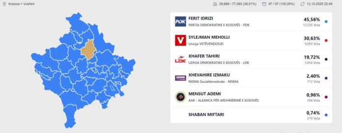 Ka përfunduar numërimi i votave në komunën e Vushtrrisë, ku zgjedhjet lokale kanë nxjerrë dy kandidatë për garën e balotazhit: Ferit Idrizin nga Partia Demokratike e Kosovës dhe Sylejman Mehollin nga Lëvizja Vetëvendosje.
